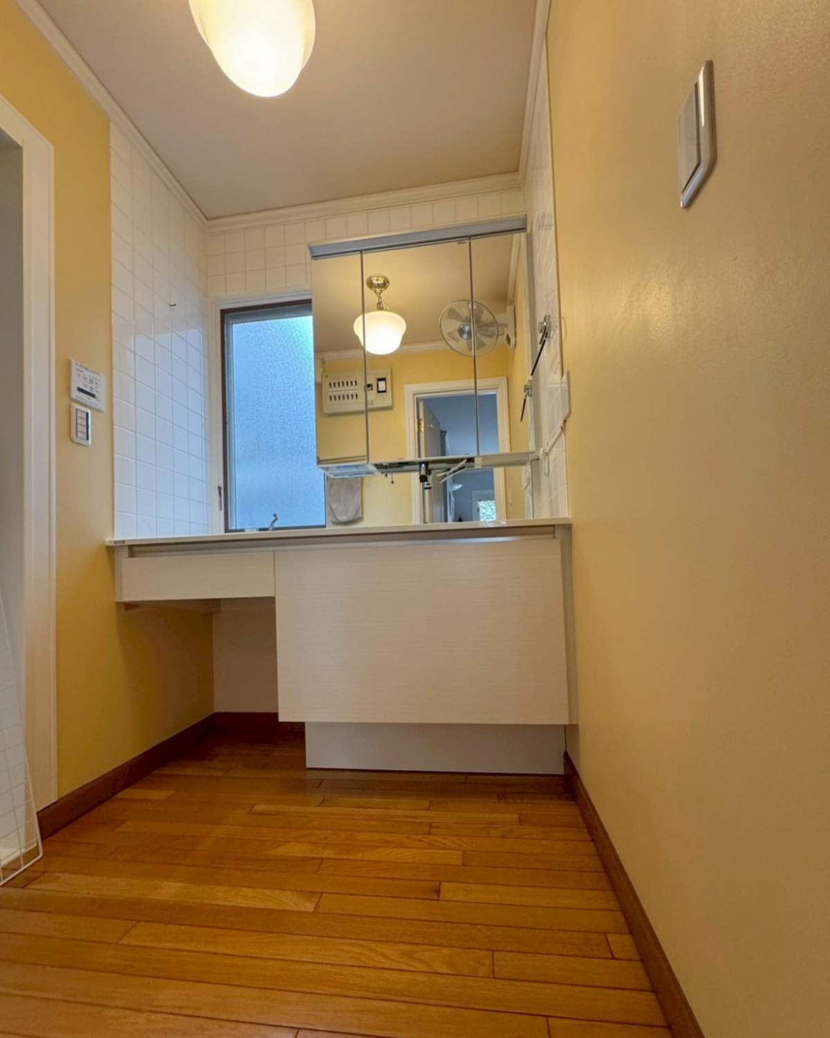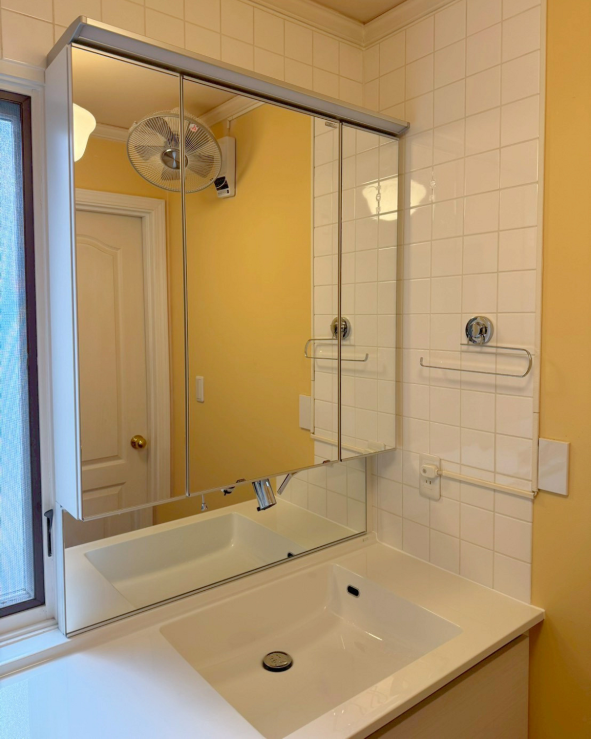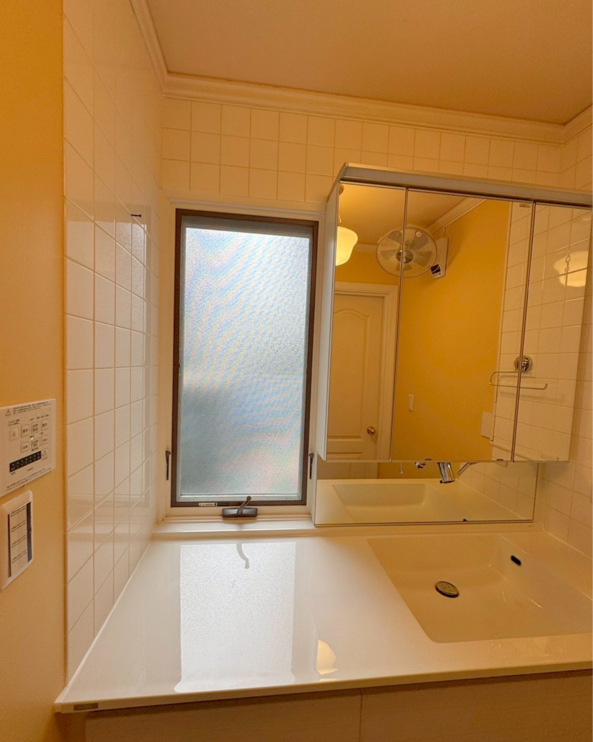 洗面ボウル上のスプラッシュ部分にはミラーパネルをご選択、ミラーキャビネットとの一体感も向上、やわらかなイエロー(壁)・白(洗面台)・シルバー(鏡)のバランスが、心地よい素敵な洗面空間を演出しています。