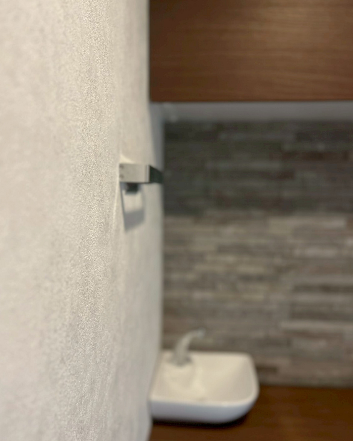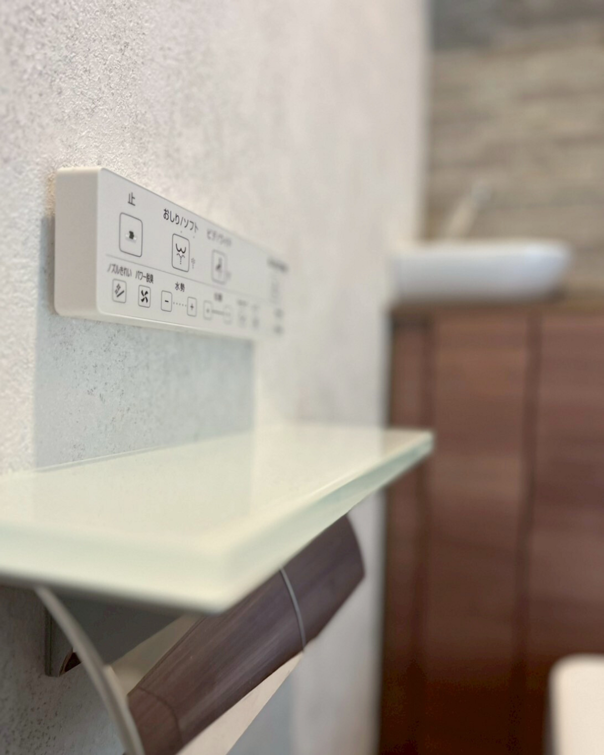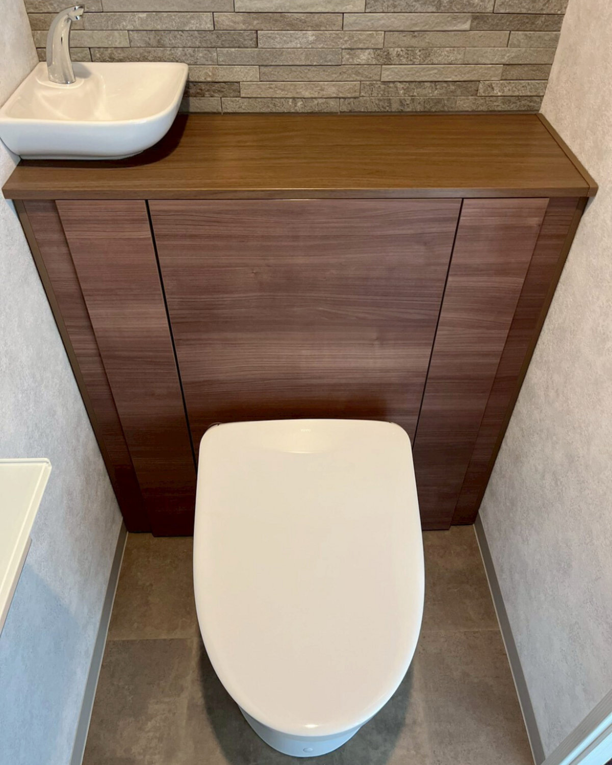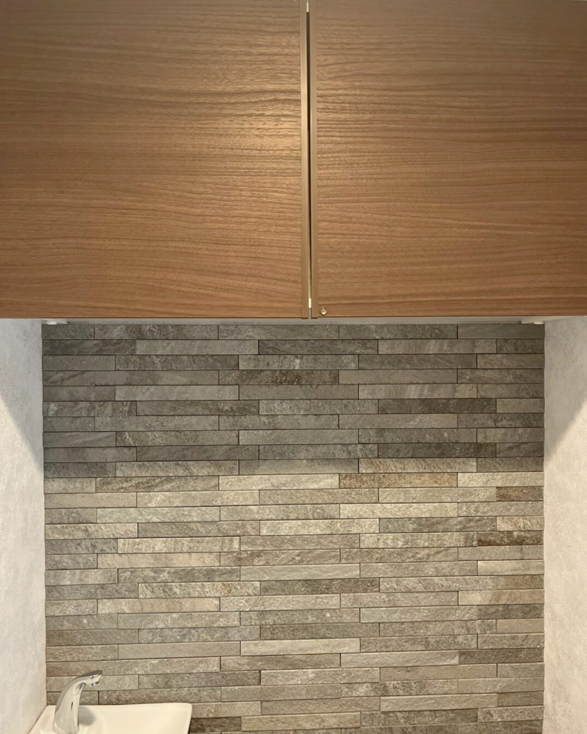 ウォール収納キャビネットと共に、トイレットペーパーや掃除用具などをすっきりと収納できる機能性と美しさを兼ね備えた空間に仕上がっております。
